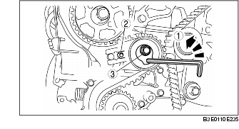 (1) Turn the timing belt tensioner adjustment arm counterclockwise to apply slight tension to the timing belt.