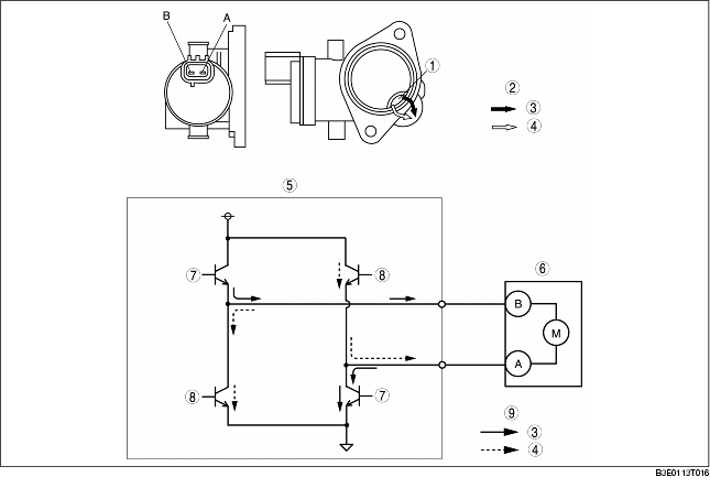 • When 12 V is applied to the variable tumble shutter valve actuator terminal A, the gear moves counterclockwise and the variable tumble shutter valve closes. Conversely, when 12 V is applied to the variable tumble shutter valve actuator terminal B, the gear moves clockwise and the variable tumble shutter valve opens.