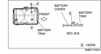 2. Install with battery cover hooks D aligned with the battery tray flange at two points.
