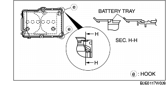 1. Assemble with battery box hooks E aligned with the battery tray holes at two points.