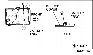 2. Install with battery cover hooks D aligned with the battery tray flange at two points.