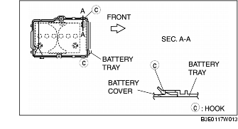 1. Assemble with battery box hooks E aligned with the battery tray holes at two points.