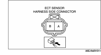 3. Place the ECT sensor in the water and while increasing the water temperature, measure the resistance between ECT sensor terminals A and B.